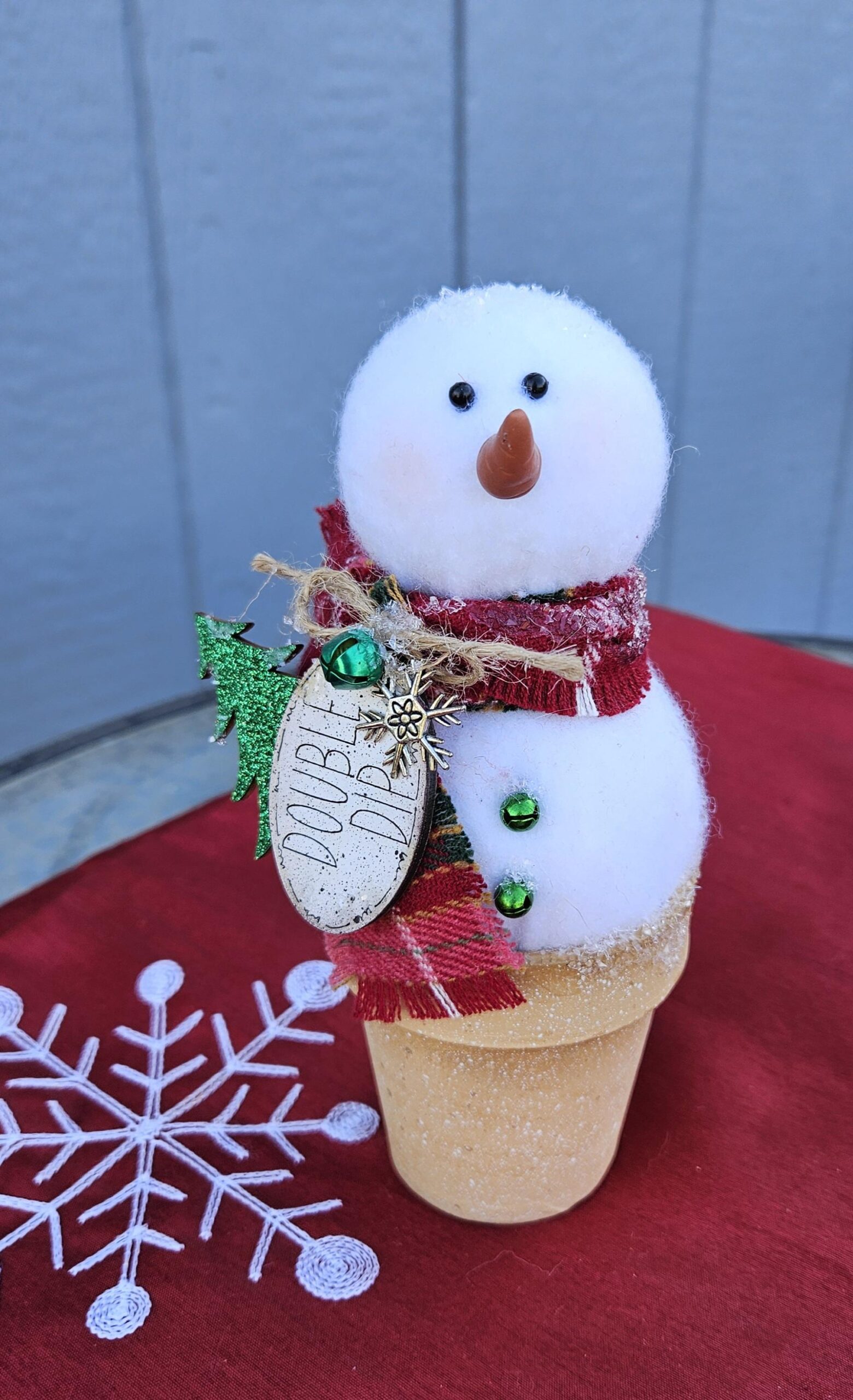 Handmade fabric snowman in painted pot