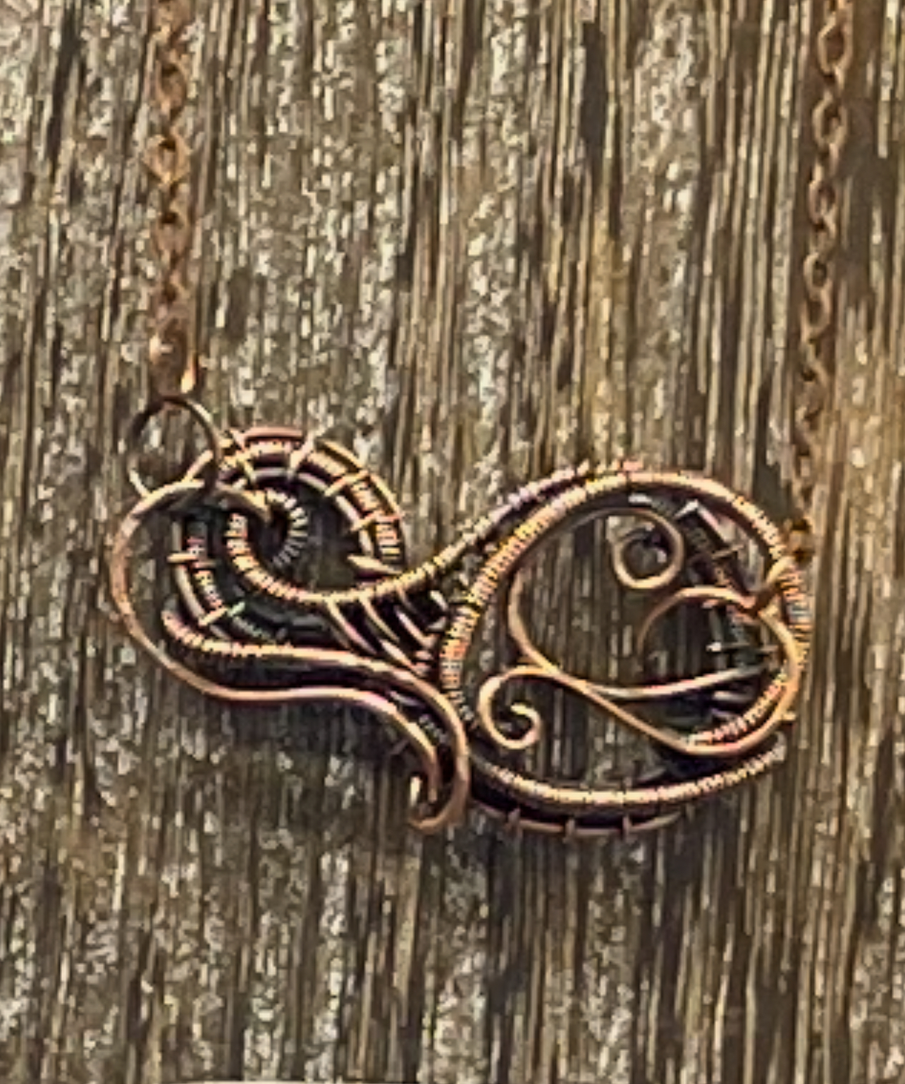 Abstract infinity heart pendant made from recycled electrical wire. Oxidized and polished for a classic antique look.